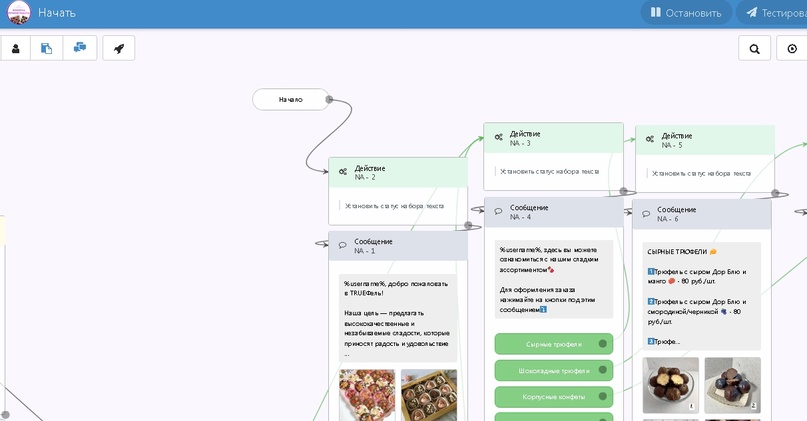 • После чего написали скрипт для чат-бота, добавили в него ассортимент конфет Заказчицы
